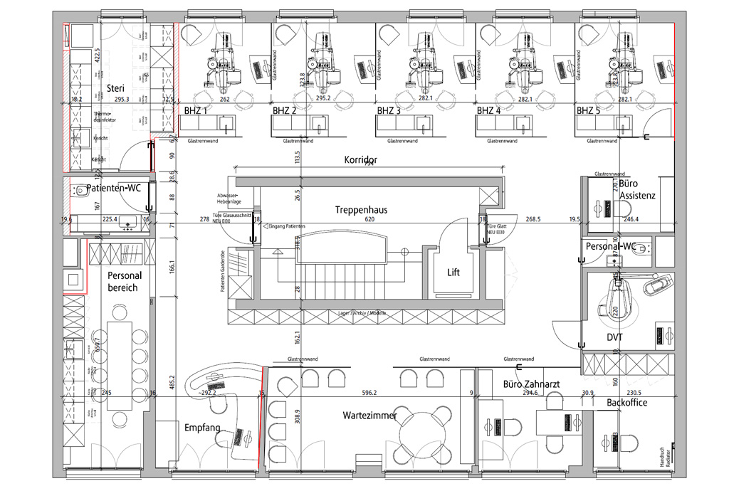 Unsere Aufgabe bestand darin, dass wir im 5. OG eine bestehende Praxis für Kieferorthopädie erneuern und erweitern durften. Wir entschieden uns bereits im Wettbewerb Dr. Ryf eine Etappierung bekannt zu geben. D. h. wir planten die Praxis bereits im Entwurf so um, dass wir die wichtigsten Räume der bestehenden Praxis zuerst im neuen Teil einrichten, sodass wir mit nur einem zweimal 14-tägigen Unterbruch den Umbau realisieren konnten. Im Weiteren zeigten wir bereits im Wettbewerb erste Visualisierungen, um Dr. Ryf von unserer Idee zu überzeugen. Die wichtigste gestalterische Idee war, dass wir der Meinung waren, das es nicht mehr zeitgemäss ist, alle Behandlungseinheiten in einem grossen gesamten Raum unterzubringen, sondern dass jeder Behandlungsplatz einen eigenen Raum erhält. In der Corana-Pandemie 2020-2021 hat sich dieses Konzept sehr bewährt und dank dieser Lösung konnte die Praxis ihren Betrieb mit wenigen Anpassungen ständig aufrechterhalten.