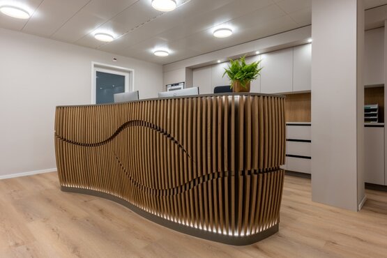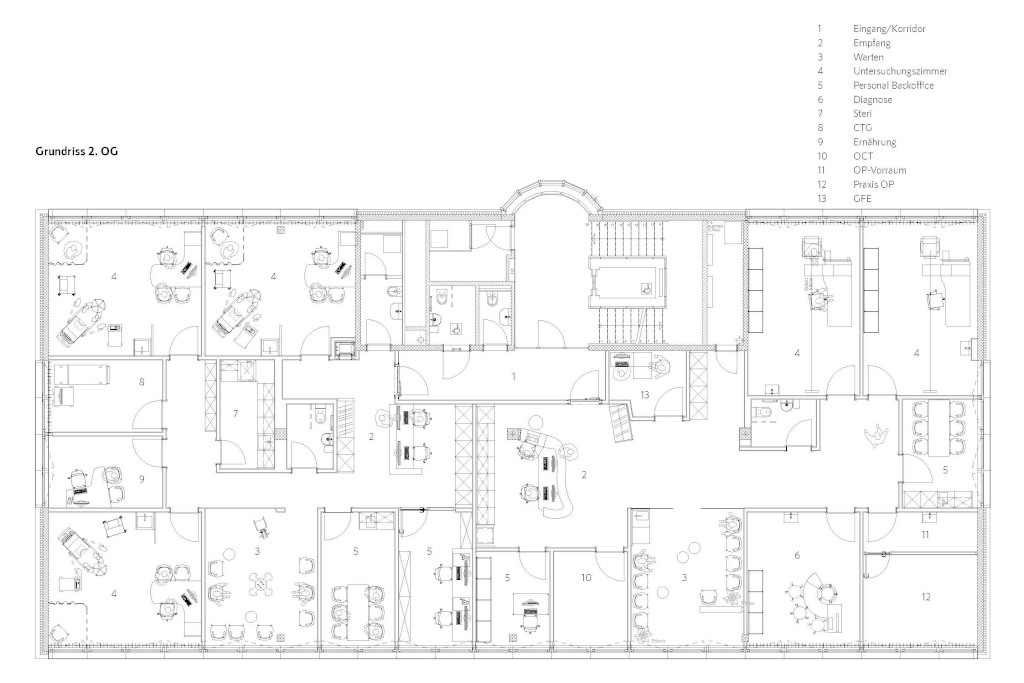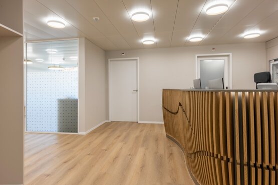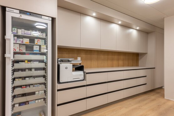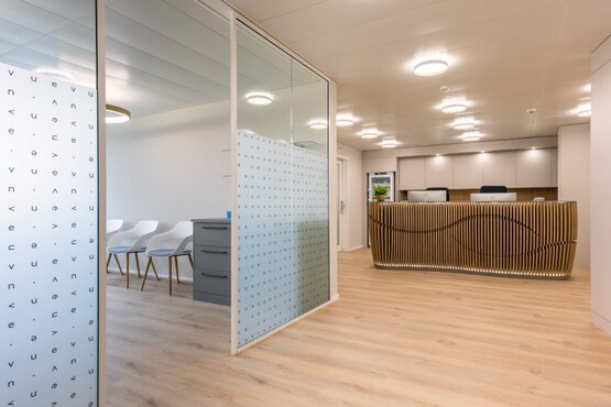 Bei der Planung einer Augenarztpraxis ist es wichtig, eine angenehme und funktionale Atmosphäre zu schaffen. Der farbige Grauton an den Wänden vermittelt Ruhe und Entspannung, was für Patienten in einer medizinischen Einrichtung von Vorteil ist. Das eichen farbige Vinyl verleiht dem Raum zusätzliche Attraktivität und ist hygienisch hervorragend zu reinigen und pflegen. Im Bereich des Praxis-OP verlegten wir einen ableitfähigen Kautschuk-Bodenbelag. Mit der Idee des Empfanges in massiver Eiche mit eingefrästem Auge verleihen wir der Praxis ein besonderes Gesicht. Im Wartebereich werden bequeme und altersgerechte Sitzgelegenheiten angeboten. An der Fensterfront befindet sich eine kleine versteckte Nische als Kinderecke. Im Weiteren haben wir in den Untersuchungszimmern die korrekten Raumgrössen erarbeitet, um den Augenärzten die beste Möglichkeit der Augenheilkunde für die Patienten anbieten zu können. Die Ophthalmologie Praxis verfügt über modernste Technologie, um eine genaue Diagnose und Behandlung zu gewährleisten.