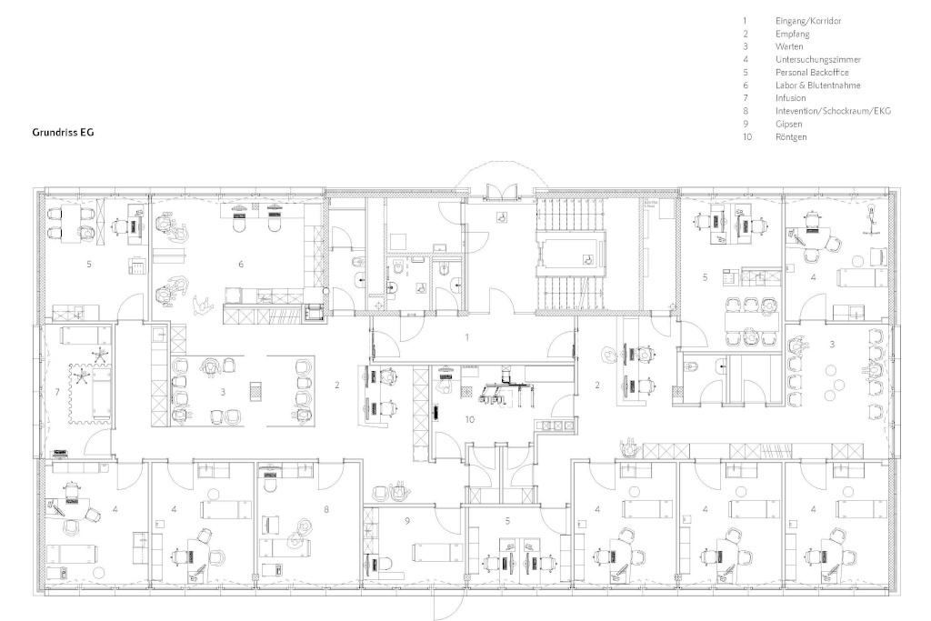 Wir erhielten den Auftrag im Erdgeschoss des neuen Ärztezentrum Grenchen eine Notfallpraxis zu realisieren.