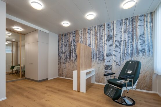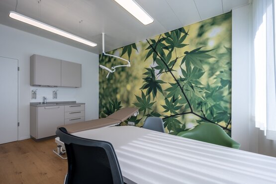 In der Planung der Notfallpraxis orientierten wir uns am Konzept des 1. Obergeschoss weil diese Räume durch das selbe Personal betrieben wird. Auch hier war es uns wichtig, eine gemütliche und einladende Umgebung zu schaffen, in der sich die Mitarbeiter:innen und Patienten wohl und sicher fühlen. Wir beachten in der Planung den Einsatz von gutem LED Licht um eine angenehme und einladende Umgebung zu schaffen. Die Sitzgelegenheiten sind bequeme und ausreichend dimensioniert so dass die Patienten im separaten Bereich für die Wartezeit entspannen können. Im weiteren spielen wir leise und beruhigende Musik im Hintergrund ab, um eine entspannte Atmosphäre zu schaffen. In den Untersuchungszimmer hohlen wir die Natur durch die Wandtapeten in die Räume. Das Labor im Notfall ist ein zentraler Ort im Erdgeschoss. Sämtliche Praxen im neuen Ärztezentrum Grenchen können Ihre Blutanalysen über einen internen kleinen Warenlift an das Labor senden. Im Erdgeschoss ist ein grosses Röntgen einplant wo von beiden Praxen im EG wie auch vom 1. OG genutzt wird.