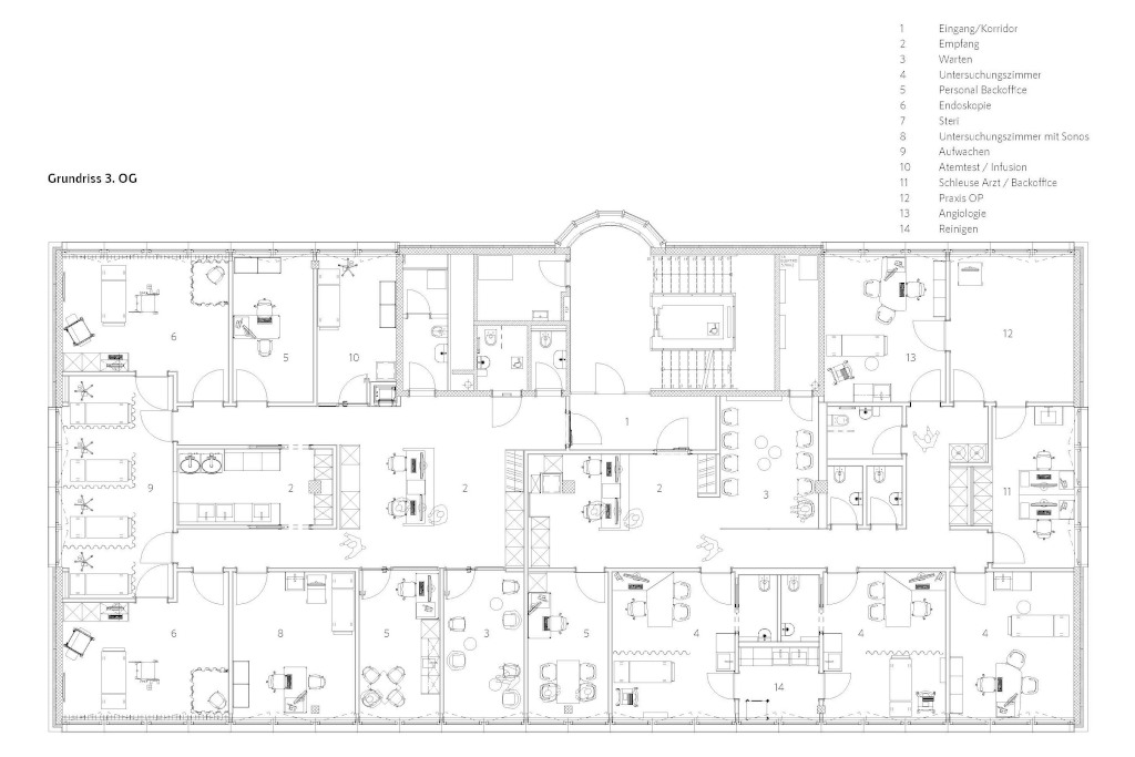 Wir erhielten den Auftrag im 3. Obergeschoss des neuen Ärztezentrum Grenchen für die Solothurner Spitäler AG eine Praxis für Urololgie und Vizeralchirugie zu planen.