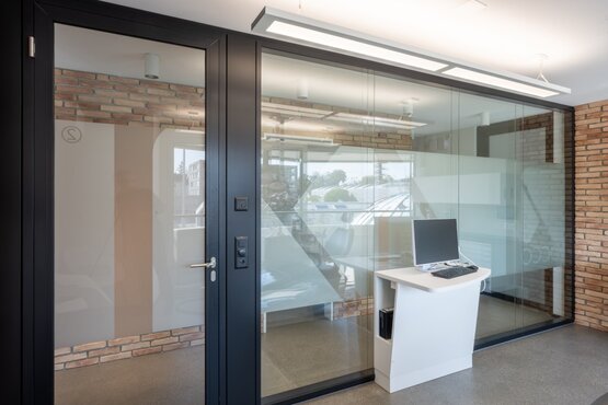 Die beiden Zahnärzte hatten ursprünglich den Wunsch, eine Praxis in einem alten Fabrikgebäude zu eröffnen. Dieses Unterfangen erwies sich als schwierig. Wir fanden über mehrere Jahre hinweg nie das passende Lokal. An der Esplanade in Biel entstand ein Neubau für Gewerbe und Wohnen. Wir nutzen diese Gelegenheit, um die Vorteile des Neubaus zu nutzen und die Dental Leitungen direkt im Beton einlegen zu können. Wir haben die Idee der alten Fabrik nie aus den Augen verloren und so entstand die Idee vom Verblender in der Innenzone und dem eingefärbten anthrazit farbigen Unterlagsboden. Wir haben dies mit sechs Millimeter Keramikplatten als Abdeckungen für die Dental- und Sterilisationsmittel kombiniert. So entstand eine eigenwillige Gestaltung mit viel Atmosphäre und den Mut für eine neuartige Gestaltung in einer Zahnarztpraxis in Kombination mit viel Glasflächen.