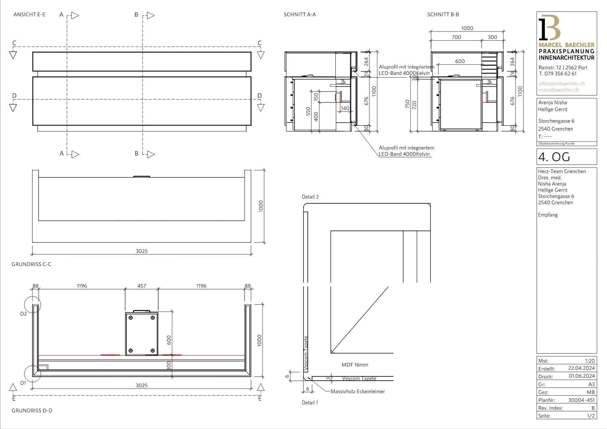 Nachdem der Auftrag zur Gestaltung der neuen Kardiologie-Praxis im 4. Obergeschoss erteilt wurde, begann unser Team mit der kreativen Planung. Die Ärzte hatten klare Vorstellungen: Sie wünschten sich eine moderne und zugleich ansprechende Atmosphäre, die sowohl Professionalität als auch Wärme ausstrahlt. Die Farbpalette sollte Rot und Weiss umfassen.