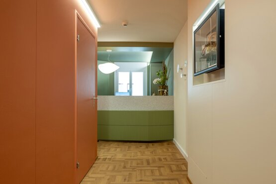 Das Farbkonzept lebt von bewusst gesetzten Kontrasten, die die eher kleinen Räume optisch weiten. Akzentwände in "Ocre Rouge“ bringen Wärme und Energie, während helle Flächen in "Porzellan Weiss“ für Leichtigkeit und Offenheit sorgen. Möbelfronten in tiefem Agavengrün verstärken die ruhige, seriöse Wirkung der Praxis. Ergänzt durch ein speziell entwickeltes Eichenvinyl-Design entsteht ein wohnlicher Charakter, der die funktionalen Anforderungen angenehm einbettet.